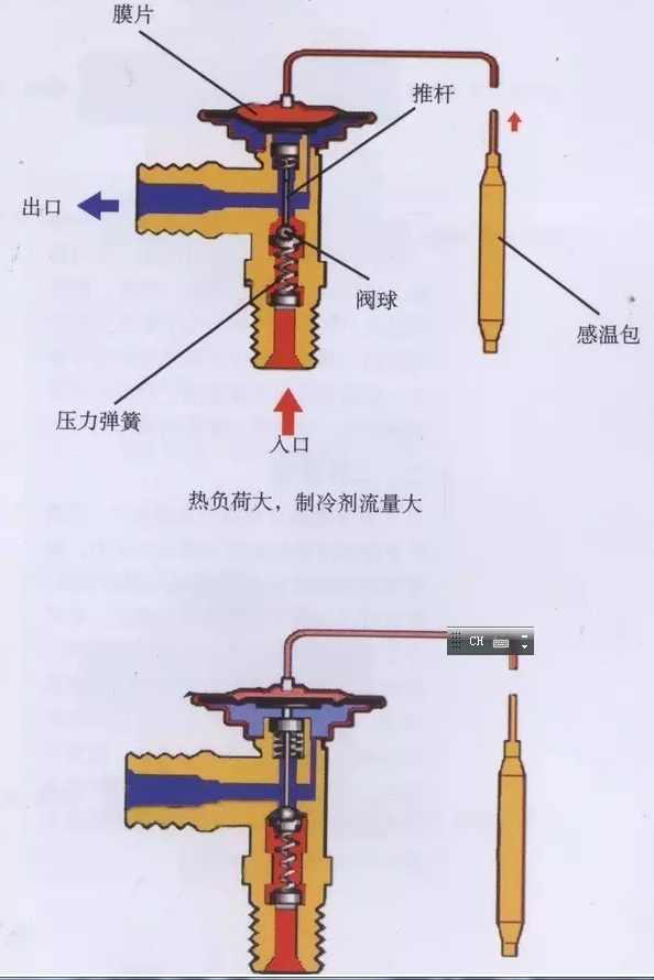 工作時(shí),固定在蒸發(fā)器出口管道上的感溫包感應(yīng)蒸發(fā)器出口的過熱溫度,使感溫包內(nèi)產(chǎn)生壓力,并由毛細(xì)管傳到膜片上部的空間,在壓力的作用下膜片以彈性變形的方式把信號傳遞給頂針(執(zhí)行機(jī)構(gòu)),從而調(diào)節(jié)閥們的開度,控制制冷劑的流量。