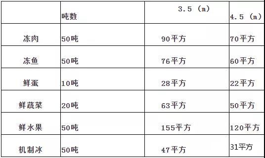 根據(jù)噸位就可以換算出冷庫面積。高度是必需知道的另一個(gè)前提。高度以最常規(guī)的3.5米和4.5米為前提總結(jié)以下冷庫產(chǎn)品的換算結(jié)果。